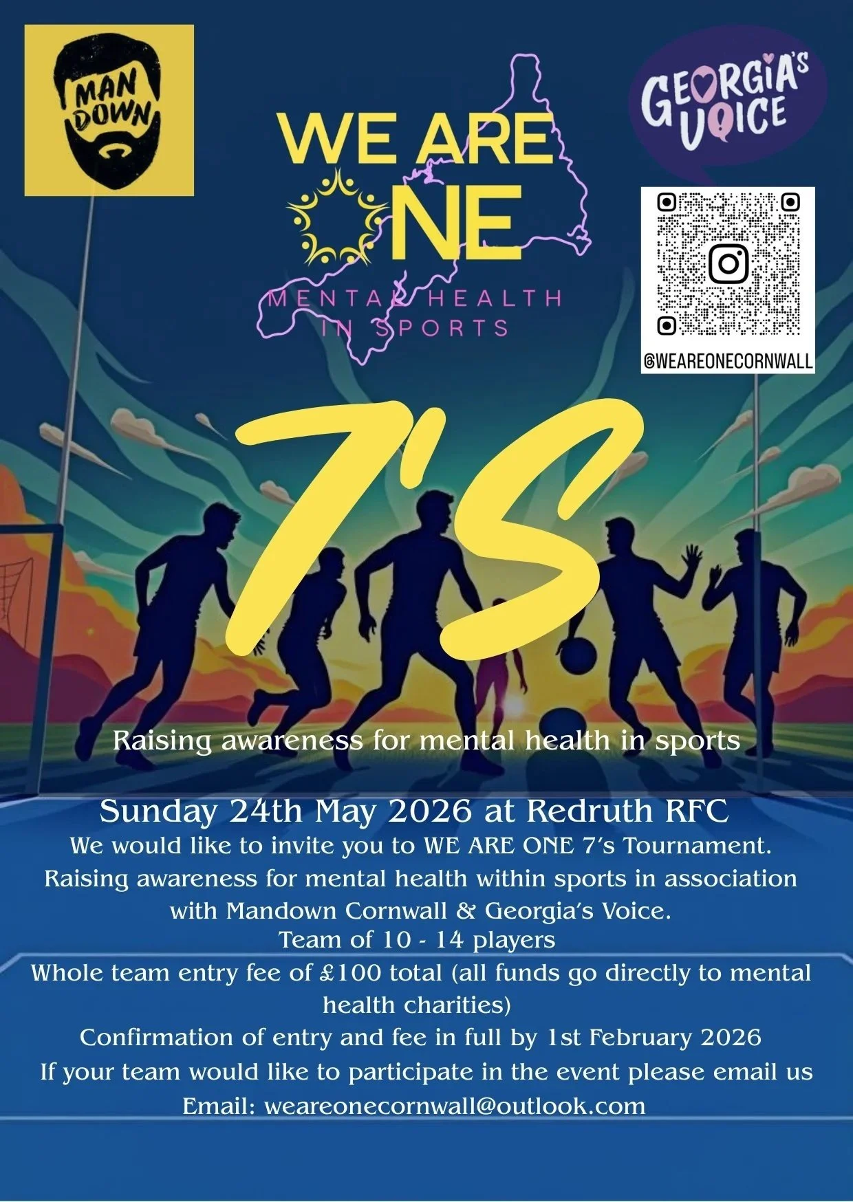 The WE ARE ONE 7’s is a community-led, family-friendly rugby tournament taking place on Sunday 24th May at Redruth RFC, created to raise awareness and start meaningful conversations around mental health in sport.